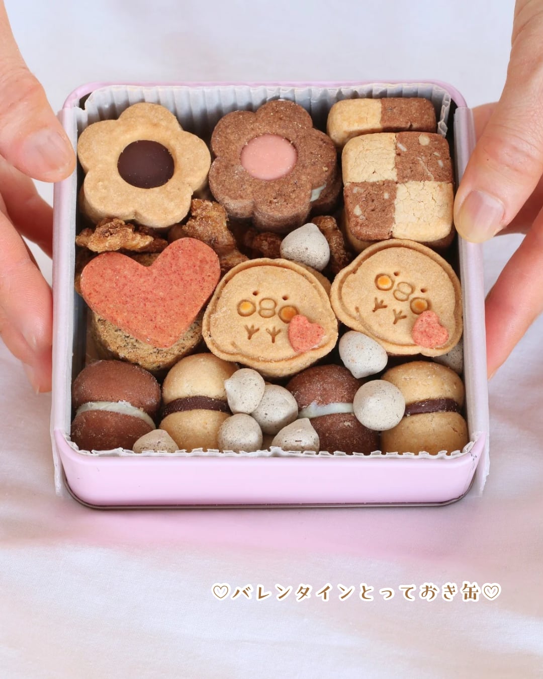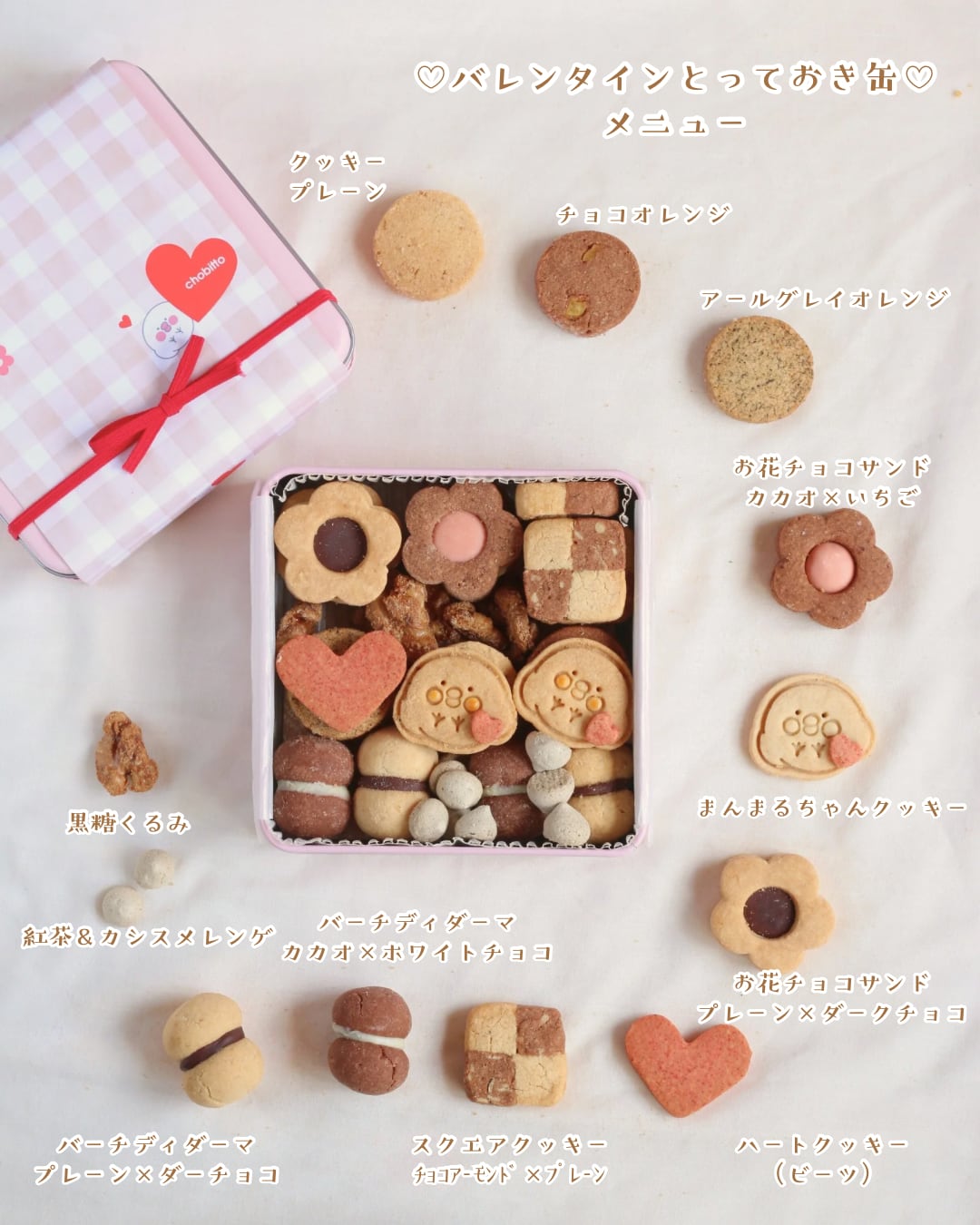 ハートを小脇に抱えたまんまるちゃん®クッキーや、お花のチョコサンドクッキーに、昨年大人気だったバーチディダーマなどを詰め込んだ、バレンタイン限定のクッキー缶です。